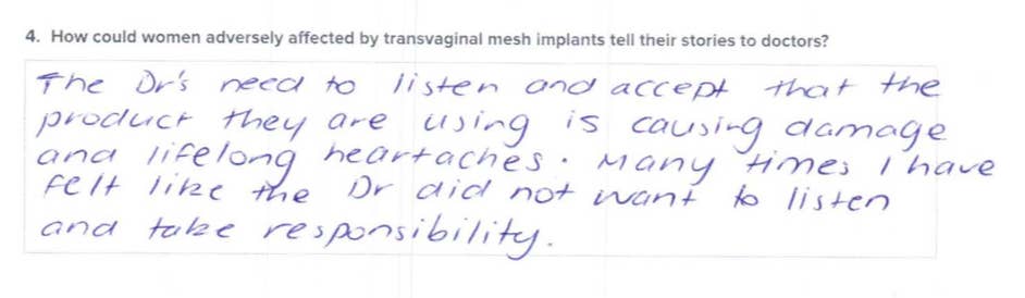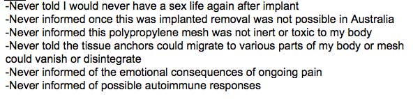„Nem tudta elmondani nekem, hogy olyan szövődmények, mint idegen testválasz, pudendalis idegi elzáródási szindróma, fájdalmas szex, idegfájdalom, széklet-inkontinencia, hólyag inkontinencia vagy szemhéj erózió valószínűleg műtét után, és örökre rontják az életem. Mindegyik [ilyen] komplikációm volt. ”