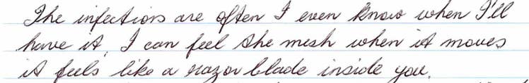 "Nyolc éve nem végeztem szexuális tevékenységet ... mivel túl kínos volt magyarázatot adni, és mivel a háló továbbra is erodálódott, ki volt téve és durva, ezért minden áron elkerültem az intim helyzeteket."