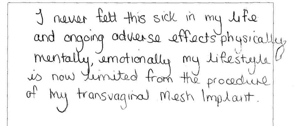 Az egyik 72 éves nő azt írta , hogy 14 éve szenvedett és "soha nem gyógyult" miután behelyezett egy transzvaginális hálóimplantátumot, hogy "javítsák a hüvely falán egy könnyet".