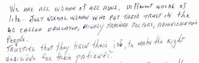 Az egyik nő anyja nevében benyújtott beadványt, amelyben azt állította, hogy hüvelyi vérzést, „állandó húgyúti fertőzéseket”, „krónikus ágyék-, csípő- és lábfájdalmat”, köldökzsinór és bursitist ( a folyadékkal töltött betétek gyulladása - bursae - amelyek párnákként viselkednek az ízületekben ).